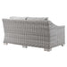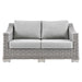 Enjoy fresh air and alfresco relaxation with the Conway Outdoor Patio Wicker Rattan Loveseat. Wrapped in UV-resistant light gray synthetic wicker rattan, this patio loveseat boasts organic texture and a neutral hue that brings a calming presence to your outdoor space. The frame of this outdoor two-seater sofa is crafted with durable powder-coated aluminum and rests on L-shaped legs with plastic foot glides. Thick foam padded cushions covered with removable, water-resistant polyester covers offer a comfortable seat and affix securely to the loveseat with cord tension attachments. Trending aesthetics and a classic design define this outdoor patio furniture collection making it a beautiful addition to any outdoor space including the backyard, patio, porch, balcony, or poolside. Assembly required. Patio Loveseat Weight Capacity: 600 lbs.