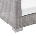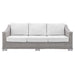 Enjoy fresh air and alfresco relaxation with the Conway Outdoor Patio Wicker Rattan Sofa. Wrapped in UV-resistant light gray synthetic wicker rattan, this patio sofa boasts organic texture and a neutral hue that brings a calming presence to your outdoor space. The frame of this outdoor three-seater sofa is crafted with durable powder-coated aluminum and rests on L-shaped legs with plastic foot glides. Thick foam padded cushions covered with washable water-resistant Sunbrella� fabric covers offer a comfortable seat and affix securely to the outdoor couch with cord tension attachments. Trending aesthetics and a classic design define this outdoor patio furniture collection making it a beautiful addition to any outdoor space including the backyard, patio, porch, balcony, or poolside. Assembly required. Patio Sofa Weight Capacity: 900 lbs.