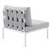 Engage life with Harmony Outdoor Patio Armless Chair. Enjoy casual conversation under the open sky with an all-weather waterproof outdoor chair from a versatile furniture set that delivers an exceptional outdoor porch, patio, balcony, or garden experience. An exceptional modern outdoor furniture set that exceeds expectations, Harmony Patio Armless Chair comes with silk polyester seat back weave, square powder coated aluminum bases, Sunbrella� cushions, and non-marking foot caps. An outside sectional armless chair that arranges according to the spontaneous needs of your guests, set your sights on open and inspired moments with the Harmony Outdoor Patio Collection.
