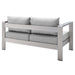 Enjoy your patio or backyard leisure time with the strong and durable Shore Aluminum 7 Piece Outdoor Patio Furniture Set. Made with anodized brushed aluminum frames and non-marking black plastic foot caps, Shore comes outfitted with resilient Sunbrella� fabric canvas cushions tested to last through all weather conditions. The Shore Outdoor Aluminum Outdoor Patio Set complements your casual gatherings with a look and functionality you can rely on. Set Includes: 1 Sofa, 1 Loveseat, 2 Armchairs, 1 Coffee Table, 2 Side Tables
