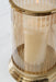 | Details | Made with metal and light amber carved glass, Brass-tone finish, Holds 1 pillar candle up to 3" (not included) | |