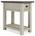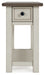 | Details | Made of wood, white oak veneers and engineered wood, Two-tone (weathered gray and antique white) finish, Chairside end table features plank-styled top, Smooth-gliding drawer perfect for holding remotes and more, Integrated 110V power supply with dual USB charging ports, Black faceted hardware, Assembly required | |