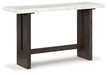 Dressed to thrill, this simply stunning sofa table offers a high-design look at a down-to-earth price. Ultra-sleek lines are accentuated with a dark waxy brown oak finish that’s so easy on the eyes. Clean-lined and modern, the plinth base and natural marble tabletop showcase quality craftsmanship and attention to detail. This table is the perfect sofa companion for a living room or family space, with a timeless look that's made to last.