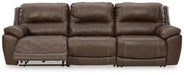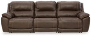 Load up on comfort in a cool, clean-lined and contemporary way with this power reclining sofa in chocolate brown. Rest assured, the expertly matched leather and faux leather upholstery is enriched with a pebble grain effect for authentic appeal and enhanced with jumbo stitching for dramatic contrast. It features a one-touch power control with adjustable positions, along with an Easy View™ adjustable headrest that allows a primo view of the TV even when you're reclined. Extended ottomans provide extra length for leg comfort. A zero-draw USB plug-in at your fingertips lets you charge up as you chill out.