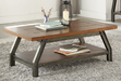 Heavily influenced by industrial design, the Holverson Collection will lend a unique look to your personal space. Gunmetal finished wood framing provides sturdy structure and profile to this cocktail table offering. Faux rivets provide additional detail to the metal bracketing that is prominently on display. A rustic brown milk crate finish is utilized to highlight the acacia veneer. Open shelving allows for prominent display of your favorite decorative items. Coordinating end table, sofa table, dining, home entertainment and bedroom are also available.