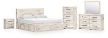 Lawroy King Panel Storage Bed with Mirrored Dresser, Chest and Nightstand