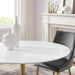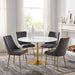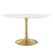 Let modern inspiration flow while gathered around the Lippa 48" Round Dining Table. Perfect for entertaining family and friends or everyday dining, this pedestal table comfortably seats four. Its round tabletop is crafted with MDF with a high gloss finish and beveled edge for a contemporary yet timeless design. Embodying an iconic mid-century silhouette, this pedestal dining table floats on a sleek tapered metal pedestal base with a chip-resistant brushed gold finish. Includes non-marking felt pad to protect flooring. Assembly required.