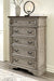 Cottage quaint styling and quality construction make this chest of drawers a dream come true. A two-tone finish provides rustic warmth, with an antiqued gray body and a rich, deep walnut on the top. Framed drawer fronts and dark bronze-tone hardware marry classic elegance and homey charm. Five smooth-gliding drawers are crafted with quality dovetail construction.