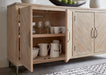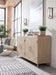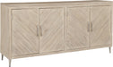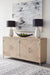 The hallmark of this design is the natural Biscotti finish and the use of texture, wood grain and inlay patterns to subtly tease the eye. The brushed stainless metal legs and uniquely designed hardware provides a subtle contrast. The transitional style will fit flexibly into multiple interior styles and spaces.
