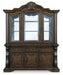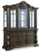 | Details | Includes dining buffet and hutch, Made with hardwood solids, oak and ash swirl veneers with MDF substrates and cast resin components, Dark brown finish, Hutch with beveled glass windows. mirrored glass interior, 2 clear glass shelves and LED display lighting, Buffet cabinets each with single adjustable shelf and finished drawers with felt lining, Assembly required | |