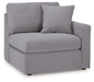 Details Includes 4 modular pieces: left-arm facing corner chaise, armless chair, console with storage and right-arm facing corner chair, "Left-arm" and "right-arm" describe the position of the arm when you face the piece, Modular pieces can float anywhere; sides are finished (with no connectors), Corner-blocked frame, Loose reversible seat and back cushions; high-quality foam cushions wrapped in poly fiber, Throw pillows included; soft polyfill, Polyester upholstery, Next-Gen Nuvella™ is a family-friendly fabric that is soft, easy to clean, stain-resistant and durable; easy-to-remove zippered covers for machine washing, Clean fabric with mild soap and water, let air dry; for stubborn stains, use a solution of 4 oz. bleach to 28 oz. water, Non-skid legs, Console with plexiglass top; pull-out drawer for storage, Platform foundation system resists sagging 3x better than spring system after 20,000 testing cycles by providing more even support, Smooth platform foundation maintains tight, wrinkle-free look without dips or sags that can occur over time with sinuous spring foundations