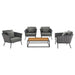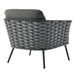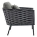 Gather family and friends for pleasant weather and good conversation with the Stance Outdoor Collection. Boasting a contemporary modern look, Stance features woven polyester fabric rope seat back and flared powder-coated aluminum frame, slatted synthetic wood tabletops, and waterproof all-weather fabric cushions with plush 5" thick, dense foam padding provide a relaxing spot to lounge. A versatile set designed for long-lasting durability, each piece in the Stance Collection can be mixed and matched and effortlessly arranged to fit the spontaneous needs of you and your guests. Cushion Thickness: 5"H. Chair Weight Capacity: 331 lbs. / Sofa Weight Capacity: 551 lbs.