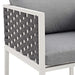 Gather family and friends for pleasant weather and good conversation with the Stance Outdoor Patio Dining Collection for an exceptional al fresco dining experience. Boasting a contemporary modern look, Stance Outdoor Dining Arm Chair features a woven polyester fabric rope seat back and sleek powder-coated aluminum frame, while waterproof all-weather fabric cushions with dense foam padding provide a comfortable seating experience. A versatile patio dining chair designed for long-lasting durability, the Stance Patio Dining Collection can be mixed and matched and effortlessly arranged to fit the spontaneous needs of you and your guests. Chair Weight Capacity: 331 lbs.