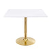 Gather family and friends for good food and conversation around the Verne Dining Table. Bringing modern influence and mid-century inspiration to your dining space, this pedestal table reflects a square shape. Perfect for entertaining or everyday dining, this dining table rests on a polished gold metal pedestal base and features a 35" square tabletop crafted with MDF and an easy-to-clean white finish. A non-marking ring around the base protects flooring. Assembly required.