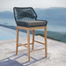 Relax amidst friends and family as you enjoy a meal al fresco with the Wellspring Outdoor Patio Bar Stool. Wellspring brings contemporary modern aesthetics to a backyard, porch, patio, or poolside with it's calming colors, organic wood grain, woven rope detail on the aluminum seat frame, and a crisscross pattern along the backrest. Featuring a premium solid teak wood base with stretchers and non-marking foot pins to protect flooring, this patio bar stool boasts a removable cushion with dense foam padding and ties to ensure a secure seat. It's versatile design makes it a stylish addition indoors too. Assembly required. Weight Capacity: 220 lbs.