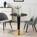 Gather family and friends for good food and conversation around the Zinque Dining Table. Bringing modern influence and mid-century inspiration to your dining space, this pedestal table reflects an organic shape. Perfect for entertaining or everyday dining, this dining table rests on a black and polished gold tapered base and features a 28" artificial marble tabletop with an easy-to-clean coating. Non-marking ring to protect flooring. Assembly required.